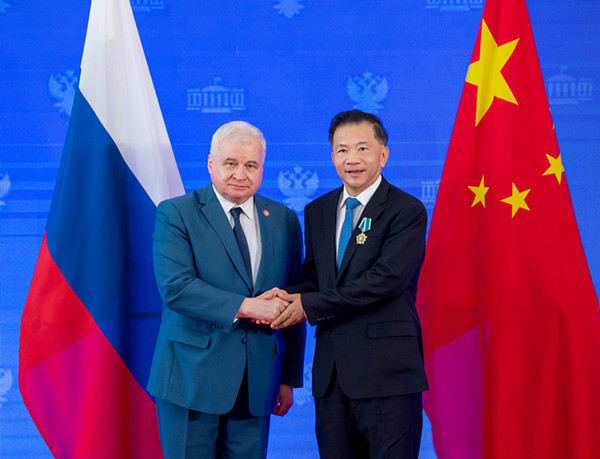 “中俄影像交流展播活动”启动活动结束后,俄罗斯驻华使馆举行授勋仪式,慎海雄接受俄方授予的俄罗斯“友谊勋章”。杰尼索夫大使宣读了俄罗斯总统令,并代表俄罗斯政府向慎海雄颁授勋章和证书,以表彰他为推动俄中文化交流和两国人民友谊所作出的贡献。(摄影 孙楠)