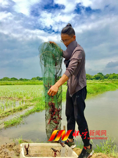 近日,秀山乡90后创业青年陈尊文在收获小龙虾,准备运往上海、江苏等长三角城市。陈尊文今年承包了300亩农田,种植水稻200亩、投放虾苗20000斤、鱼苗10000斤,推出“稻虾鱼”生态高效种养模式,预计年产值达80-100万元,比单一养殖多出2.5倍收益。程玉姣 摄