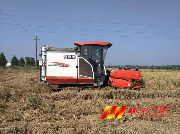 近日,金拱镇白莲圩种粮大户操作机械收割成熟的单季晚稻。连日来,金拱镇3万亩单季晚稻陆续进入收获期,当地农民利用晴好天气抢割抢收单季晚稻,确保秋粮顺利归仓。张虎 摄
