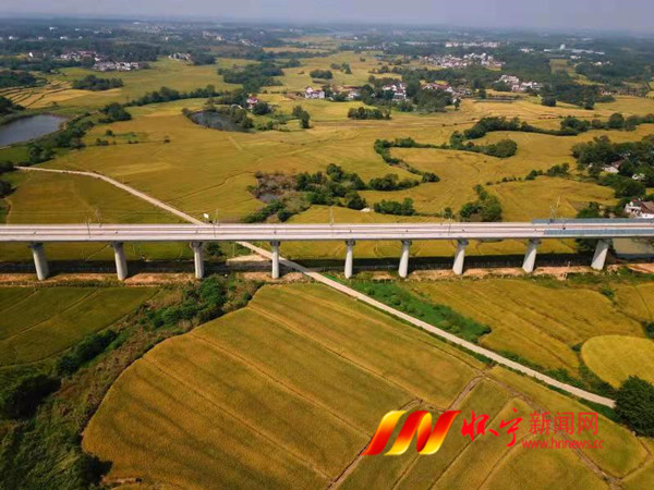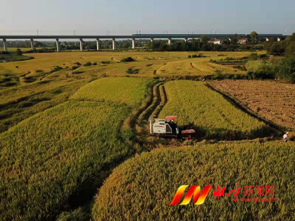 三桥镇田间地头,呈现出遍地金黄的秋收景象。高空俯瞰,田野格外俊俏,农民们正抢抓晴好天气,组织人力、机械,加紧收割水稻。高铁穿境而过,稻田平整如海洋,放眼望去,一幅色彩绚丽的田园好风光。汪万 红朱晟 摄