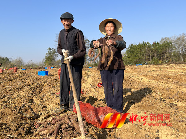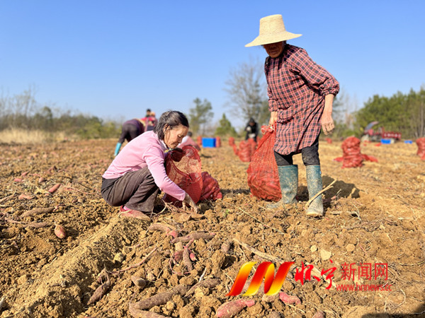 11月29日,在秀山乡栏坝社区葛榜村民组紫薯基地,20余名群众正在拾捡紫薯。据了解,为壮大村级集体经济,该乡大力扶持紫薯种植业,加大荒地荒山的流转力度,现已种植紫薯500余亩。程玉姣 摄