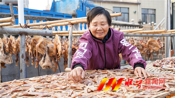 1月14日,平山镇高泽村村民村民李玉琴在家门口晒腊货。春节将至,怀宁县农村广大村民利用晴好天气,采用传统工艺手工腌制腊肉、腊肠等传统腊味食物,处处腊味飘香,喜迎新春佳节。檀志扬 杨兰兰 摄