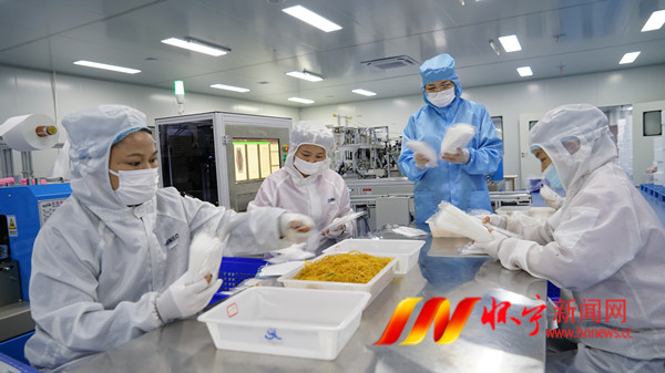 2022年3月25日,金拱镇国林医疗科技有限公司车间内,工人正在赶制出口口罩,该企业开足马力生产口罩、防护服等医疗物资,助力疫情防控。(檀志扬 操海燕 摄)