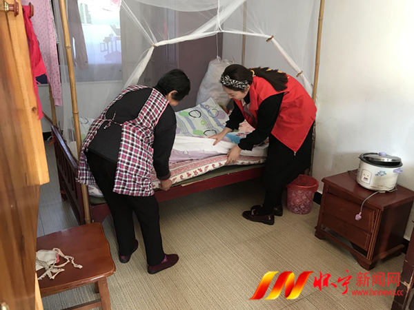 在敬老院宿舍区,志愿者们挨个房间帮助老人们打扫卫生、整理床铺、擦洗窗台,和老人们谈心拉家常,亲切询问他们的生活和身体情况。温暖的话语和真切的关怀给敬老院带来了欢笑,房间里无不洋溢着温馨的气氛。