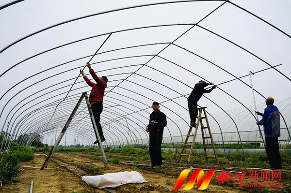 4月17日,村民在搭建大棚。三桥镇湖滨村发展20座大棚,采取大棚轮种不同经济作物的方式,根据市场需求,按需种植蔬菜、草莓等品种,提高土地产出和经济效益,将整个大棚经济效益最大化,壮大村集体经济,带动村民增收。檀志扬 刘亮 摄