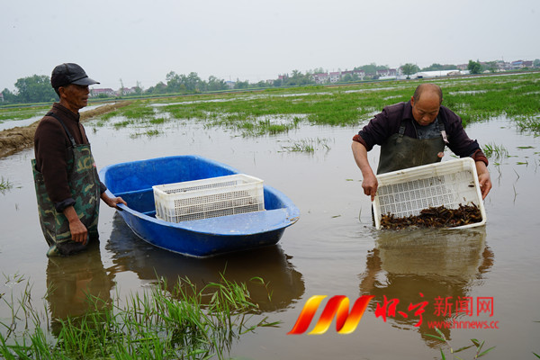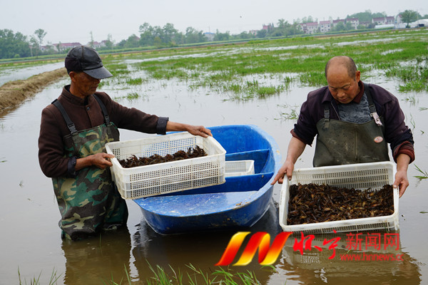 4月21日,石牌镇南保村“稻虾共生”养殖大户正在田间投放龙虾苗。南保村今年发展“稻虾共生”生态种养田近200亩,年可增加村级集体经济收入近50万元,同时带动本村村民发展“稻虾共生”1000余亩,走出了一条产业高效、富村富民的“稻虾”新路子。 檀志扬 昂海波 摄