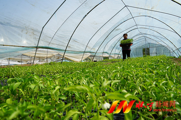 4月25日,石镜乡美好家园生态发展有限公司员工在大棚里搬运辣椒苗外运。石镜乡持续强基础,扩规模,引导农民发展蔬菜大棚产业,让蔬菜大棚种植户走上增收致富快车道。檀志扬 刘铮 摄