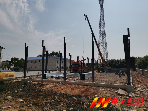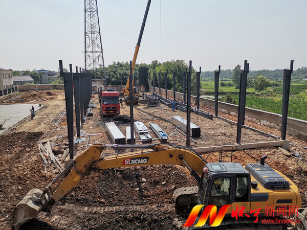 6月9日,在黄龙镇优质粮油项目建设现场,晒场硬化工程施工基本完成,工人正在进行钢构厂房安装工程施工。据了解,该项目投资120多万元,占地1000多平方米,预计8月份建成投产,年产值将达60多万元。陈锐 刘龙 摄