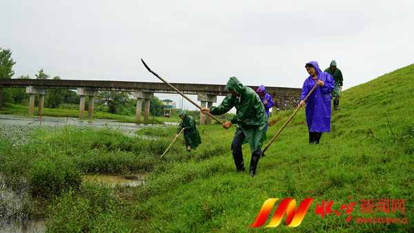 6月24日,雷埠乡雷埠村党员先锋队,冒雨在泥塘沟河右岸巡查堤坝。近期强降雨持续,江河水库水位上涨较快,我县严格落实好防洪防汛工作,组织党员先锋对加强对各河流山塘水库的检查、巡查,及时发现和排除险情。同时严格落实汛期24小时值班制度,严密监测雨水情变化。檀志扬 蒋善模 摄