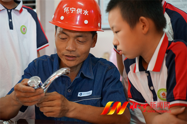 8月14日,在马庙镇枫林中心学校的“暑期快乐大本营”里,学校专门请来供水师傅教孩子们节约用水常识。