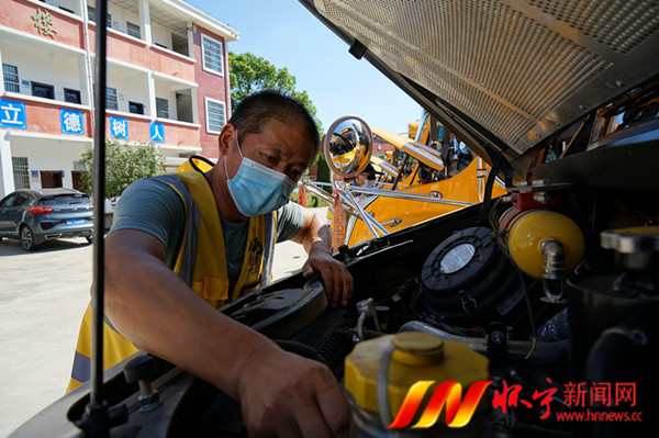 8月21日,雷埠乡中心学校校车驾驶员在认真检查车辆状况。临近开学,我县组织工作人员对辖区内所以校车的车况、车载逃生设施、安全装备、车载GPS等逐一检查,排除安全隐患,以确保学校如期开学,学生平安出行。檀志扬 邱乾龙 摄