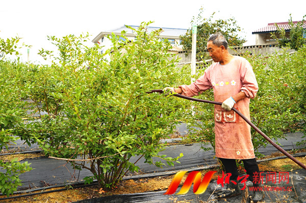 9月25日,在公岭镇蓝莓种植基地,村民正在为蓝莓浇水,保障安全度过“高温”,提高成活率。受持续晴热高温天气影响,全县7万余亩蓝莓果树出现不同程度的旱情,抗旱保苗形势严峻,我县采用人工作业和机械作业相结合,浇灌、滴灌等多种形式,对所有蓝莓果树进行循环浇灌和滴灌,有效缓解蓝莓果树的旱情。檀志扬 锯小木 摄
