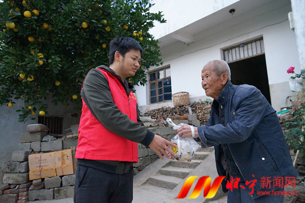 10月25日,凉亭乡鹤林村村干胡涛涛将中餐送到柏枝组86岁独居老人刘贻谋手中。鹤林村今年建成了老年助餐点,针对村里一些年龄较大、腿脚不便的独居老人无法到助餐点就餐的实际,该村成立由青年村干、志愿者组成的“敬老互助队”,坚持每天中午为他们义务送餐服务,提高老人们生活质量和幸福指数,形成孝老敬老的村风民风。檀志扬 摄