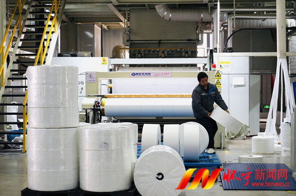 11月20日,位于马庙镇工业园区内的安徽国宏新材料科技有限公司,工人们正在生产出口环保卫生材料。该公司总投资5.16亿元,是一家以非制造布新材料研发、生产制造销售贸易为一体的企业,产品远销国内外,11条生产线日产100吨无纺布,年产值达3.5亿元。檀志扬 丁浩浩 摄