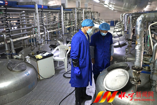 1月8日,石牌镇新雪莲生物科技有限公司员工在车间查看肠衣、肝素钠生产情况。据悉,2022年该公司生产的肠衣、肝素钠远销德国、荷兰等多个欧洲国家,创汇超过500万美元。檀志扬 潘庆谊 摄