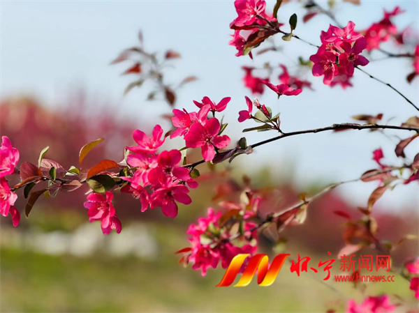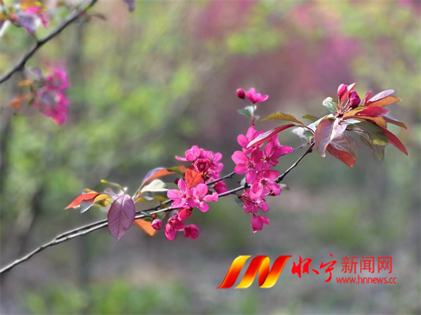 只恐夜深花睡去,故烧高烛照红妆。走进凉亭乡凉亭社区,万株海棠花开,花蕾红艳,似胭脂点点;粉黛朱颜,如晓天明霞。汪雯君 陈丽媛 操春 摄
