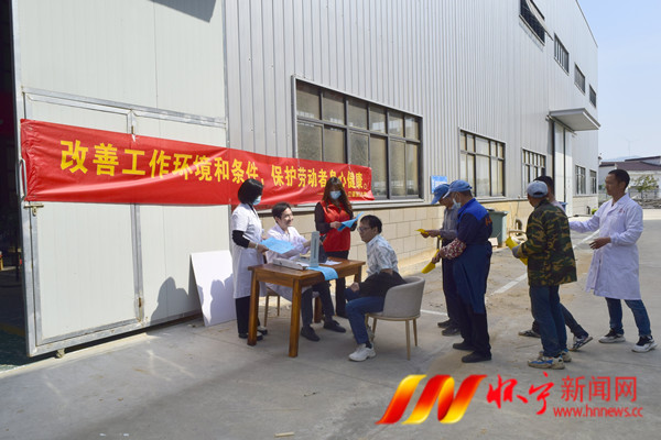 4月27日上午,江镇镇计生办联合镇卫生院、镇新时代文明实践所等部门一起走进齐明蒸笼有限公司,开展以“改善工作环境和条件,保护劳动者身心健康”为主题的职业病防治宣传活动。现场通过提供职业健康知识咨询、职业健康义诊和发放职业健康宣传资料等形式,切实保障劳动者职业健康权益,提高职业健康意识。方川 李晶晶 摄