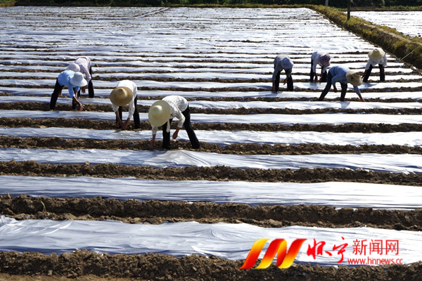 4月26日,雷埠乡李店社区村民在铺设地膜,准备种植小米辣。李店社区结银家庭农场发展小米辣椒40亩,预计年增收30万元以上,同时带动20多个村民常年在家门口就业增收。檀志扬 殷俊 摄