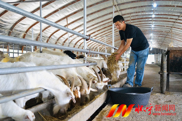 6月13日,在凉亭乡源潭铺村小马儿羊庄,饲养员在给羊添加饲料。源潭铺村近年来以壮大村集体经济为目标,大力发展山羊养殖产业,年计划6000只,走出了壮大村集体经济的新路径,激活了乡村振兴发展的新引擎。檀志扬 汪雯君 摄