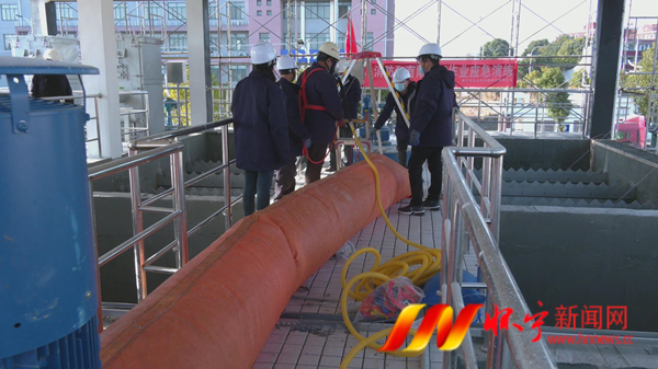 在怀宁润天水务有限公司演练现场,演练假设维修人员在污水处理初池内工作时在密闭空间内发生触电事故。事故发生后,现场人员立即向上级报告、随即启动“密闭空间事故处理预案”,密闭空间外的监护和救护人员使用三脚架和手摇绞盘将密闭空间作业人员吊出,由受专业救护培训的人员进行急救并送医。