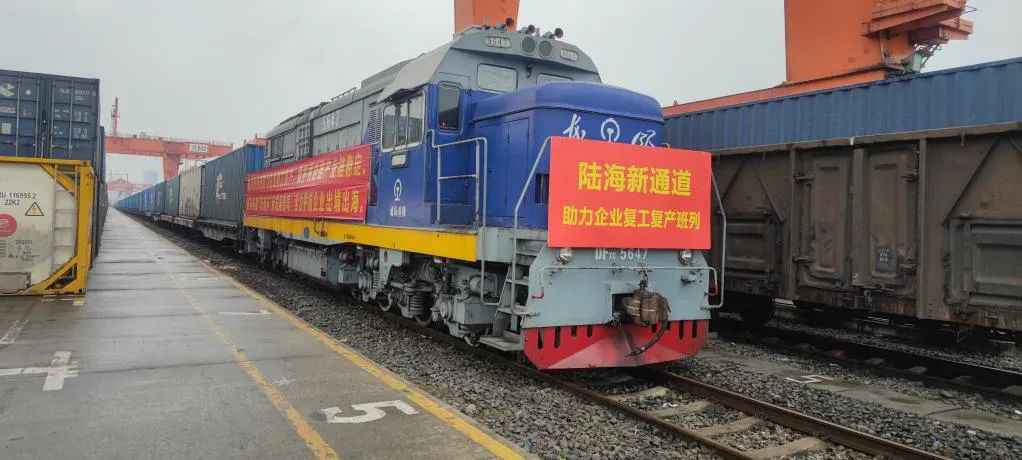 一列陆海新通道助力企业复工复产班列在重庆团结村中心站等待发车。图片来源:新华社