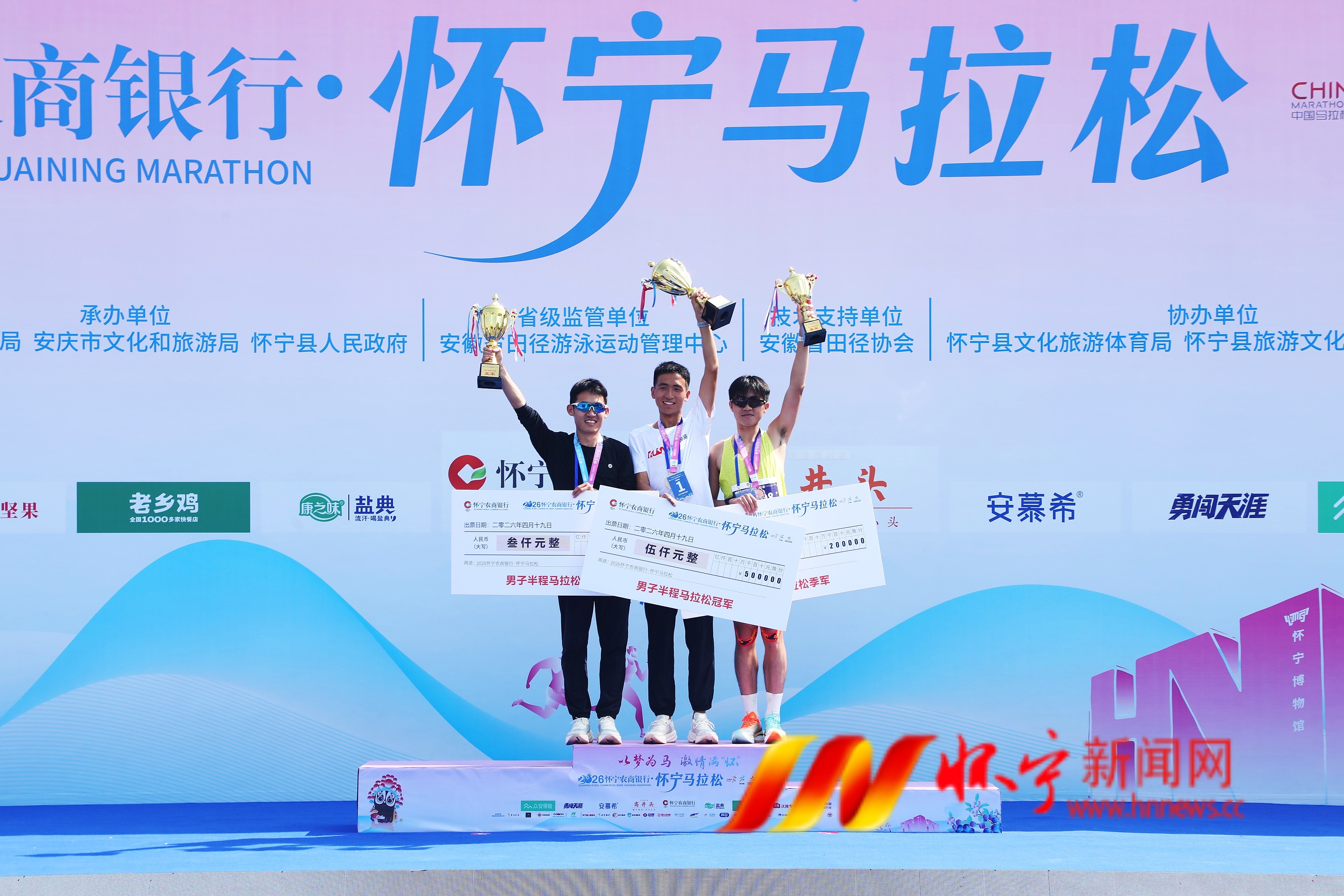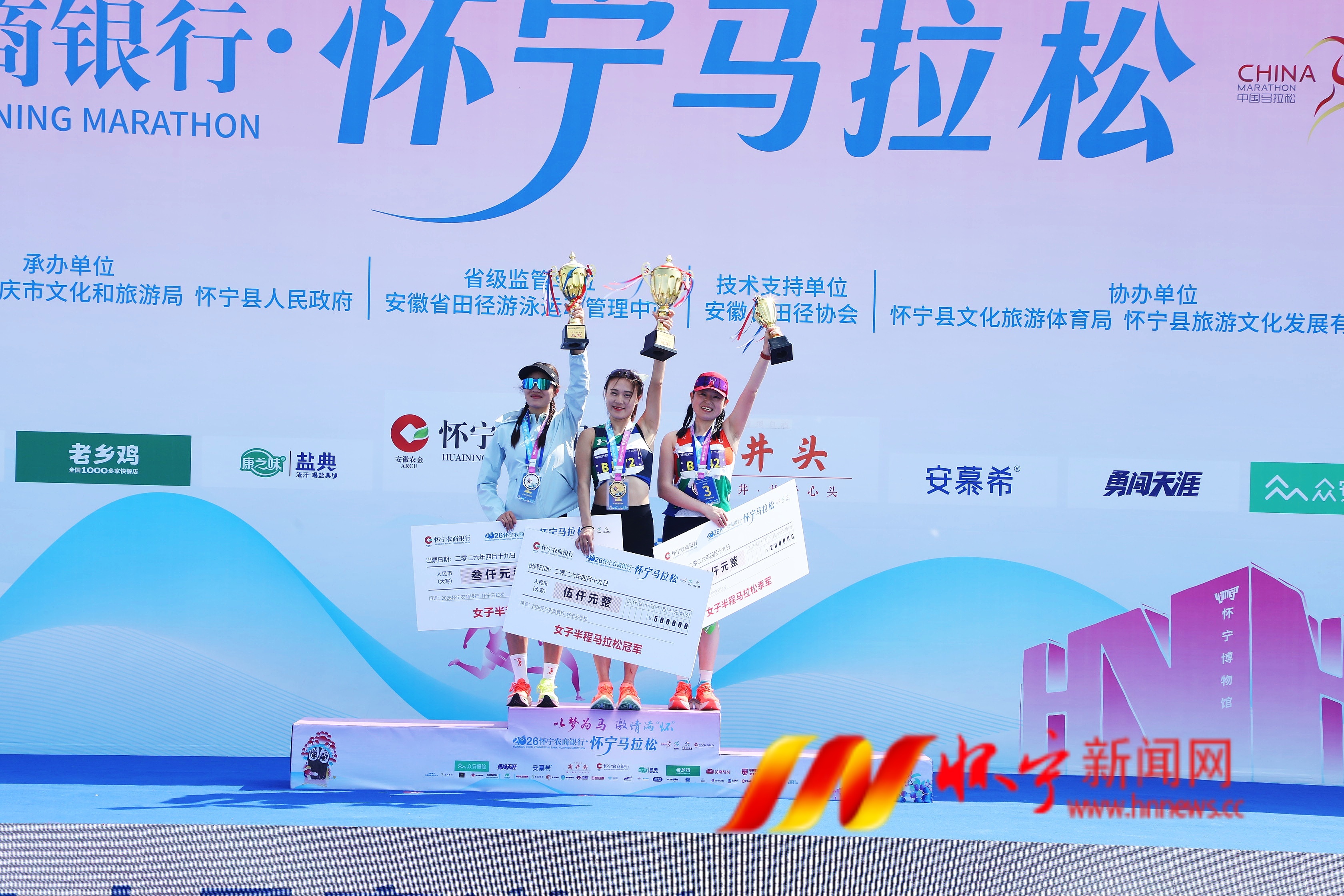 经过激烈角逐,全程马拉松男子组冠军由张立钢以2时23分35秒(破赛会纪录)摘得;亚军和季军分别由王荣松(2时25分28秒,破赛会纪录)、王志明(2时26分1秒)获得。全程马拉松女子组冠军归属常苗苗,成绩为2时43分57秒(破赛会纪录);郭翠玲(2时54分21秒)、毛金玲(3时1分58秒)分别获得亚军和季军。在男子半程项目,周航以1时8分49秒的成绩夺冠;曹欢(1时9分10秒)、潘根苗(1时9分44秒)分别获得亚军和季军。在女子半程项目,钟佳萌以1时18分55秒(破赛会纪录)的成绩获得冠军;亚军和季军分别由韩清(1时21分20秒)、吴萍(1时24分59秒)获得。参赛选手完赛后,都领到极具文化内涵的奖牌。奖牌正面以怀宁县博物馆馆藏的一级文物“唐打马球图镜”为原型,四名骑士策马击球,骏马奔腾、球杖飞扬——千年之前的大唐马球盛景,与2026马年的奔跑者隔空相望。