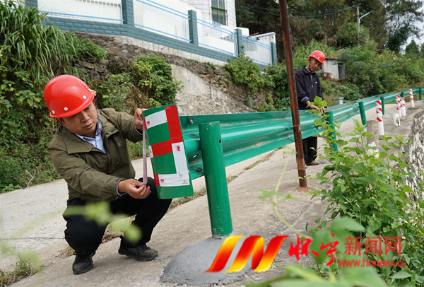 10月19日,清河乡龙池村村干和村民在刚刚安装好的护栏上张贴安全标识。龙池村属山区乡村,有多处路陡山弯,为消除安全隐患,该乡在山路边装上防护栏,为沿线群众系上出行“安全带”,让山区群众行得安心、行得舒心、行得顺心。檀志扬 陈金霞 摄