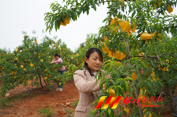 5月22日,清河乡太平村村民在为梨子套袋,改善果实外观品质,防止病虫害,提高果品质量。怀宁县引导广大种植大户走“土地集约、技术创新、科技引领、依靠品质应对市场风险”的现代农业新型经营管理方式,为丰收丰产打下坚实的基础。檀志扬 陈金霞 摄