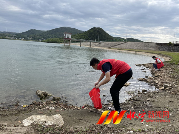 在皖埠水库,志愿者们对饮用水源地及周边区域的垃圾进行了清理,并向周边住户发放了饮用水源保护、畜禽养殖污染、水污染防治等相关法律法规的宣传单,提高其对饮用水源地的环境保护意识,引导关注和支持饮用水源保护工作。