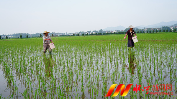 6月7日,在平山镇万亩胜天圩,村民们在水稻田里给秧苗施肥。今年种植大户早稻完成秧苗插植任务,已进入稻田秧苗的田间管理阶段,我县广大种植户们抓紧给秧苗施肥“加营养”,确保粮食丰收。檀志扬 操振东 摄
