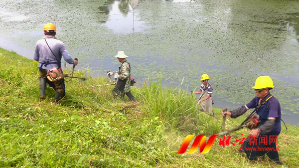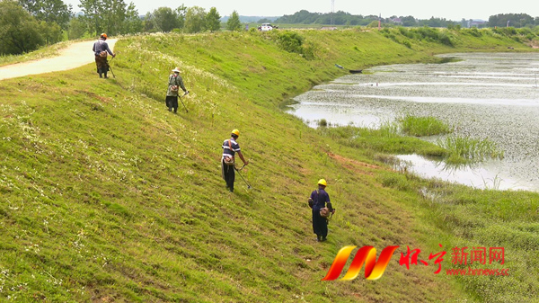在石牌镇同马大堤,村民们正忙着对大堤两岸进行清草除障。不仅如此,全镇各大堤正同步开展清草除障工作。
