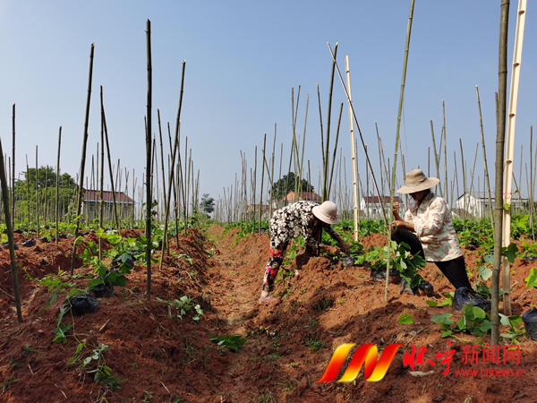 本网讯 春争日,夏争时,位于三桥镇双塘村黄岭村民组的一垄垄葛根地里,白洋湖联合党委书记李治海正在指导工人除草施肥,忙得满头大汗,一旁的葛根幼苗长势喜人。