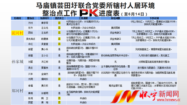 “自6月份开始,我们每半个月通报一次进度,第一次未开工的给予黄色警告,第二次没有理由仍然未开工的给予红色警告。”该镇人居办负责人指着“PK进度表”说。