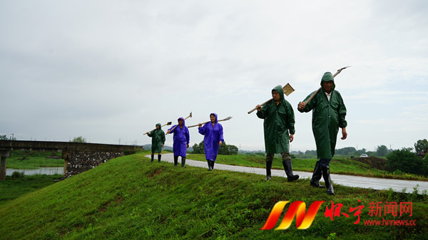 6月24日,雷埠乡雷埠村党员先锋队,冒雨在泥塘沟河右岸巡查堤坝。近期强降雨持续,江河水库水位上涨较快,我县严格落实好防洪防汛工作,组织党员先锋对加强对各河流山塘水库的检查、巡查,及时发现和排除险情。同时严格落实汛期24小时值班制度,严密监测雨水情变化。檀志扬 蒋善模 摄