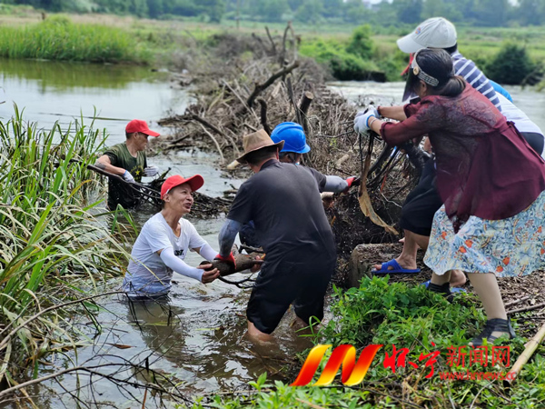 6月27日,小市镇珠流河禅师段的拦河堰上,20多名党员在清理拦河堰上的枯木树枝。近期连日降雨,珠流河水位上涨迅速,雨水将许多枯木树枝从上游冲下来,挡在拦河堰周边,严重影响汛期安全,禅师村组织党员及时打捞,确保汛期安全。檀志扬 张冰 摄