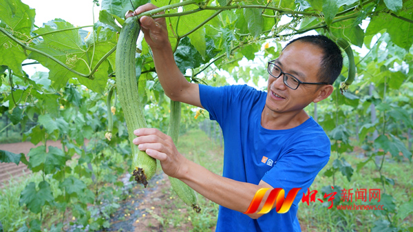 7月4日,雷埠乡李店社区村干在采摘药用丝瓜。今年李店社区引进特色种植药用丝瓜20余亩,实现村级经济增收近10万元,同时带动周边10多名村民务工增收。 檀志扬 蒋善模 摄