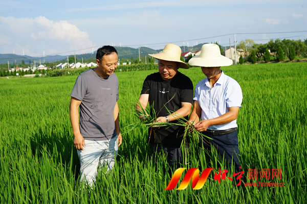 本网讯 7月5日,三桥镇农业站技术员刘建兵,在水稻田里向农户现场讲解单季稻病虫害防治和肥水管理。连日来,我县组织农技人员深入田间地头,和村民们一起对每一块稻田进行拉网式检查,指导农民科学管理稻田,确保水稻丰收。檀志扬 刘亮 摄