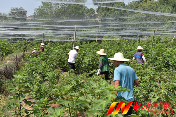 连日来,在源潭铺村无花果基地里,当地村民正冒着高温酷暑采摘成熟的无花果。源潭铺村驻村工作队副队长江海鹏告诉记者:“我们的无花果已经进入采摘期,一直要持续到10月底,现在每天大概采摘1000斤左右,最高峰每天要采摘2000多斤。”