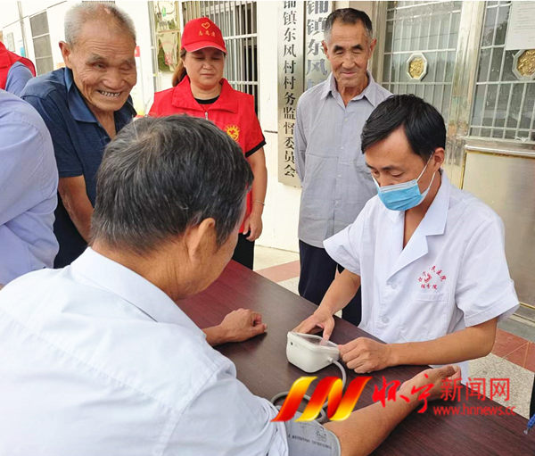 近日,洪铺镇东风村村医裴润沛正在老年助餐点为前来就餐的老人测量血压。