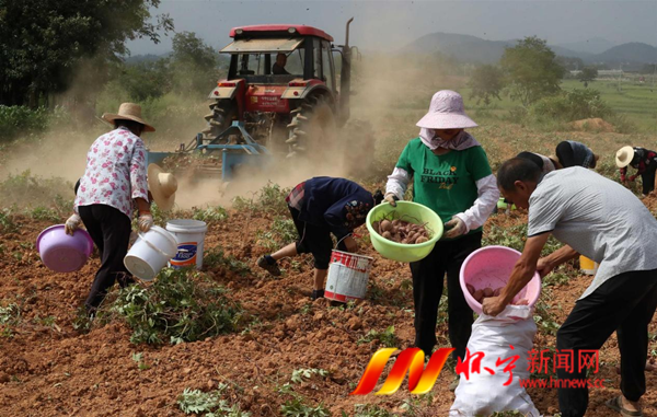 近日,在茶岭镇同形村紫薯种植基地,农机正在地里行间穿梭,伴随着轰隆隆的机器声,一串串紫薯“破土而出”,村民们正忙着割藤、采挖、装袋,一派繁忙的丰收景象。