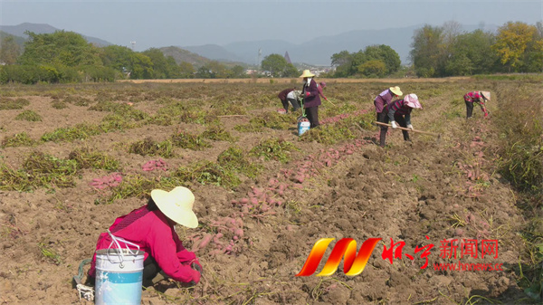 在月山镇月山社区紫薯种植基地,村干正带着村民们忙着挖紫薯,现场一派丰收景象。“今天总共安排了15个人,紫薯的品色、质量还可以,总的大概能产收七万多斤。销售走终端,分两步走,批发大概预售在5万元左右,市场零售,目前统计的大概在3万元左右,总共预计产能收入大概在8、9万元。”月山镇月山社区党总支书记毕治善告诉记者。