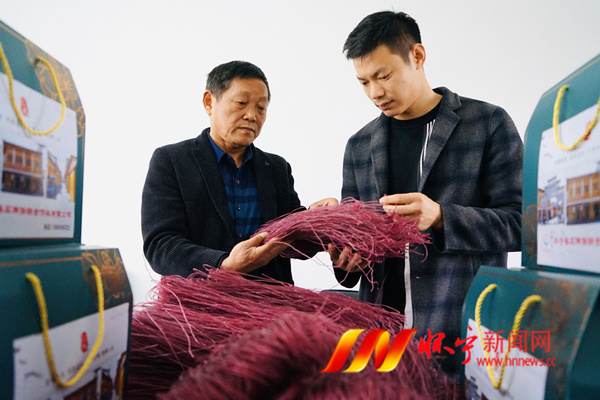 11月23日,在石牌镇电商物流示范园里,工作人员在仔细查看紫薯粉丝质量。石牌镇电商物流示范园成立不到三个月时间,发展订单紫薯1100亩,意向发展订单瓜蒌、金银花基地1000亩,通过网上销售红薯近20万公斤,有力带动农民增收,助力乡村振兴。 檀志扬 潘庆谊 摄