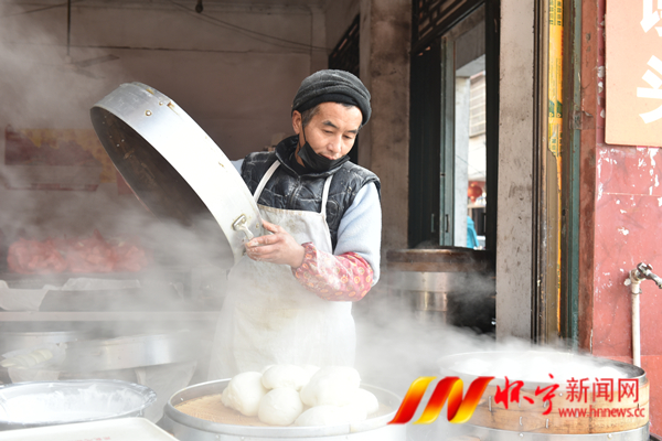早上九点钟,民族村老街上的一家馒头店门口,一屉屉蒸笼里,馒头、包子、米糕等传统面点热气腾腾,香味弥漫在整条街道。“我们店从腊月以来生意火爆,特别是年底这两天,真的忙不过来。我每天晚上都是一点半起来,到现在还在忙。”江镇馒头店老板曹长兵说道。
