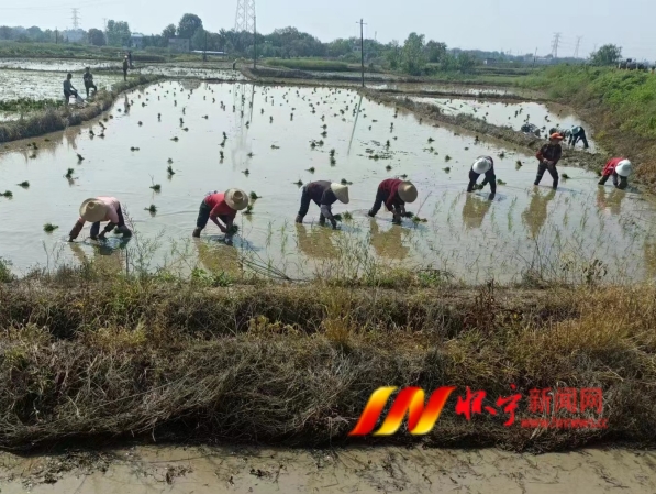 本网讯 4月25日,平山镇高泽村育秧大棚内,再生稻秧苗齐齐整整、绿意盎然,工人们麻利地将秧苗运到田边进行栽种。眼下,正是早稻、再生稻种植的黄金期。