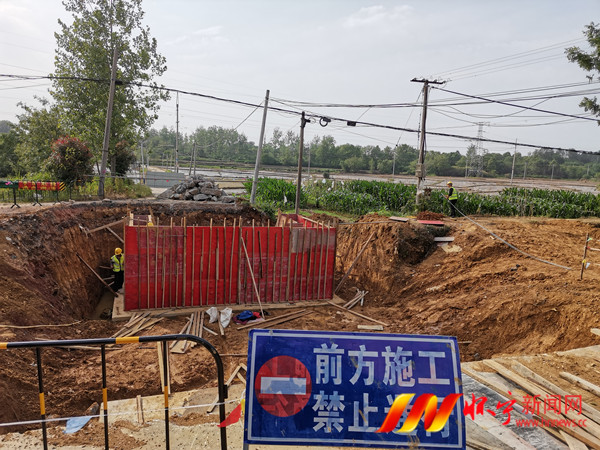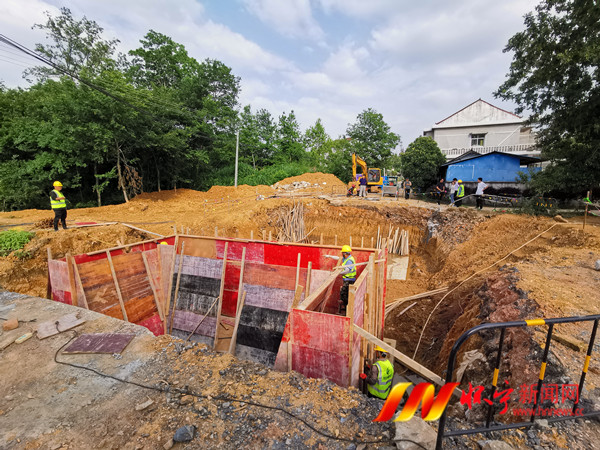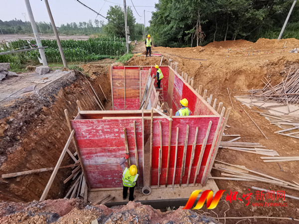 本网讯 5月23日,在黄龙镇新建桥施工现场,工人们正在搭建桥墩支架,等待水泥浇筑。