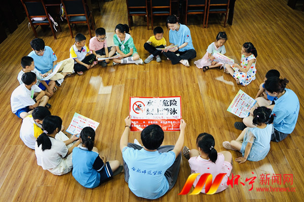 7月4日,合肥师范学院4名志愿者大学生在小市镇平坦社区,面对面向留守儿童宣传防溺水知识。暑期来临,我县及时组织党员干部、志愿者深入一线宣传走访,积极把防溺水宣传、巡查工作落到实处,通过大手牵小手,筑牢学生防溺水安全防线。檀志扬 夏琪 摄