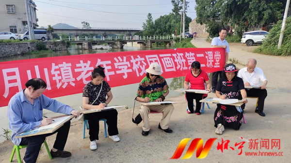在流经大桥头百年的五孔条石大桥边,来自镇老年学校国画班的学员们也支起画板,现场进行钢笔写生,在专业老师的指导下,大家认真观摩作品,聆听绘画要点,用线条勾勒出“小桥、流水、人家”动态的乡村美景。