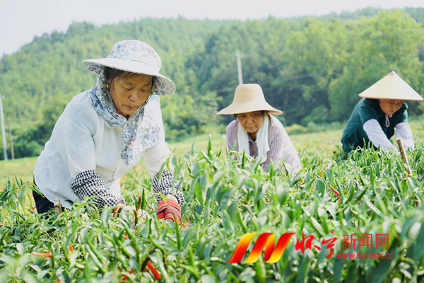 8月7日,在雷埠乡李店社区辣椒种植基地,村民在采摘新鲜辣椒。立秋将至,广大农民抓紧农时开展农事活动,田间地头一片繁忙。全面落实各项惠农政策,广大农民用辛勤汗水在土地上绘出一幅幅美丽的金色丰收图。檀志扬 殷俊 摄