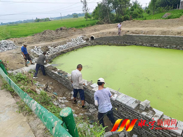 8月18日,在黄龙镇杨林村双河组当家塘整治施工现场,工人们汗流浃背,仍在忙碌着堆砌当家塘护坡。