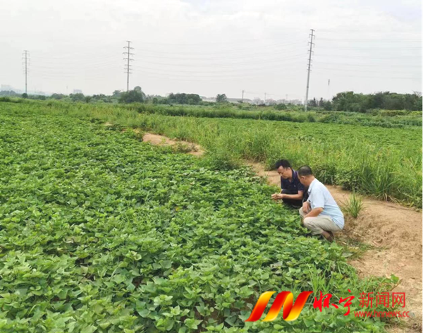 站在汪洋社区百亩紫薯种植基地里,顺着垄沟方向放眼望去,满地披新绿,紫薯藤叶生长旺盛,一片生机勃勃。在现场,该镇农技人员深入田间地头详细检查了紫薯叶片虫害情况,并翻开地垄土壤,细心查看紫薯果实(根茎部位)生长状态。